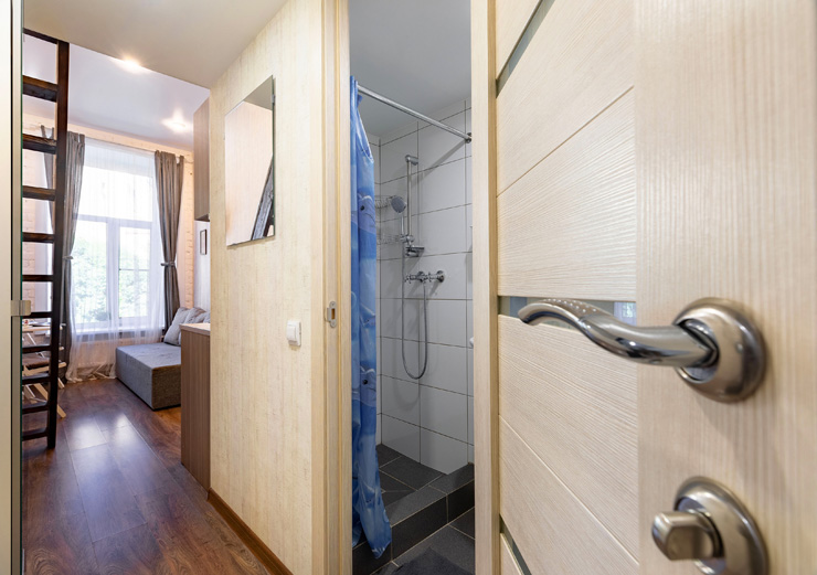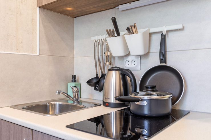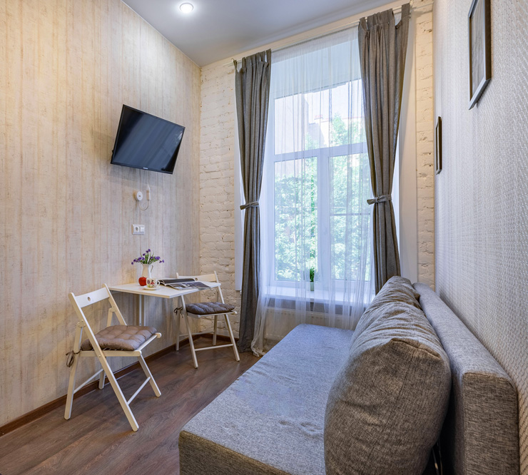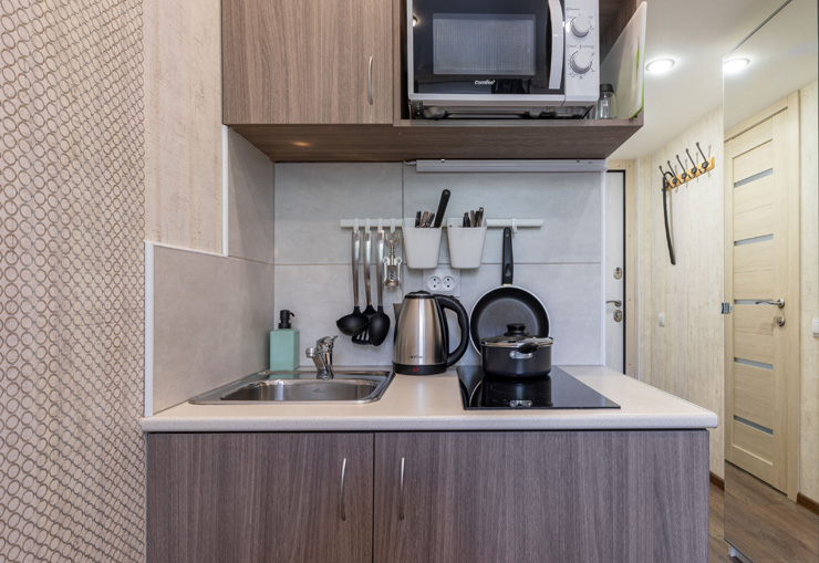 - Оборудование: микроволновая печь, мини-холодильник, набор посуды, плита электрическая, телевизор, электрочайник